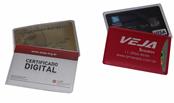 Porta cartão confeccionado em PVC para um cartão (crédito/Banco), tamanho 64x94mm, com gravação em silkscreen inclusa em uma cor.